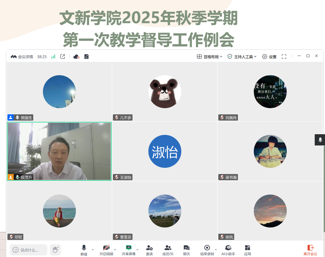 10月15日下午,文新学院秋季学期第一次教学督导工作会议以线上形式召开。学院院长段茂升、副院长樊国生、校级督导梁书瀚,院级督导刘佩伟、王淑怡、邓钗、徐凤、曹雪菲等与会。