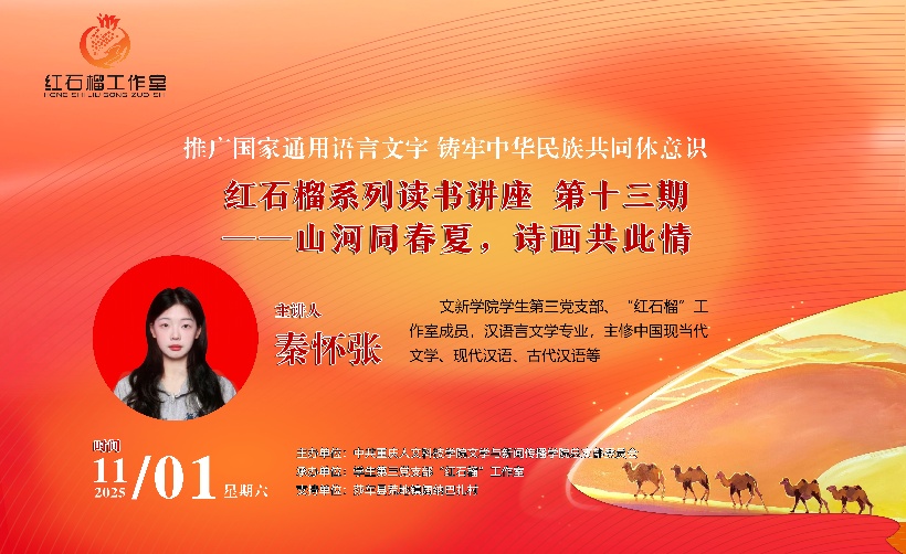 2025年11月1日,第13期“红石榴”读书讲座通过云端连线温暖启幕。文新学院师生与阔纳巴扎村孩子们跨越千里,以诗为媒,以画为桥,共同开启一场穿越时空的文化之旅。活动伊始,“红石榴”的意象如诗如画——盛开的石榴花,象征着生命的绚烂绽放;饱满的石榴籽,诠释着民族的团结一心,成为贯穿始终的精神纽带。