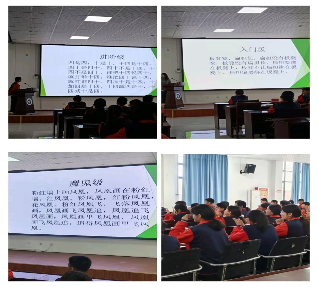 在趣味盎然的“绕口令”环节,设置了“入门”“进阶”“魔鬼”三级挑战难度。参赛代表通过抽签依次迎战,从简短的入门语句,到富含易错音的进阶内容,再到节奏紧凑的高难长句,难度逐步提升。场上选手全神贯注、吐字清晰,展现出扎实的普通话功底;台下观众热情互动,偶尔的卡顿引发阵阵欢笑,而每人两次的挑战机会更是点燃了同学们越战越勇、决不放弃的拼搏精神。来自九年级的阿卜杜扎伊尔同学在成功完成随机抽取的“魔鬼级”绕口令后兴奋地表示:“一开始觉得不可能完成,但当我集中注意力,把每个字音都发准、发清晰,那种成就感特别棒!这让我意识到,说好普通话需要细致的练习。”