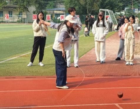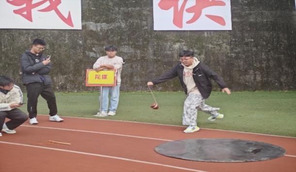 陀螺项目中,选手们挥鞭抽打陀螺,让其在指定区域持续旋转。