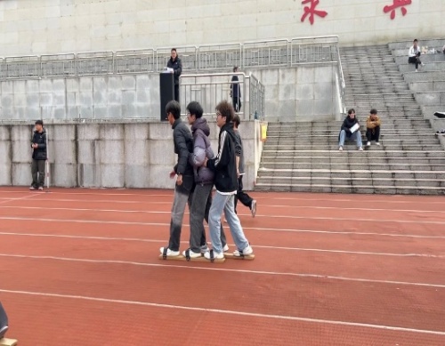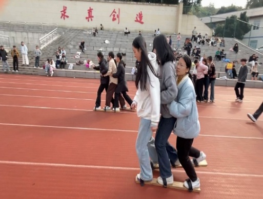 30米三人板鞋竞速项目最考验团队配合,三名队员必须步调一致才能快速前进。