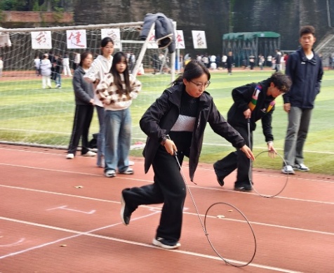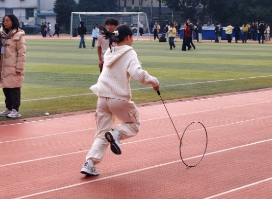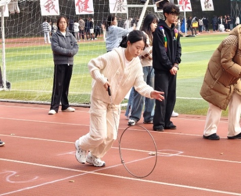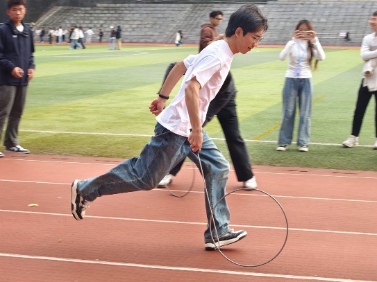 50米滚铁环项目充满趣味性,选手们手持铁钩控制铁环前进,考验着平衡能力和专注力。