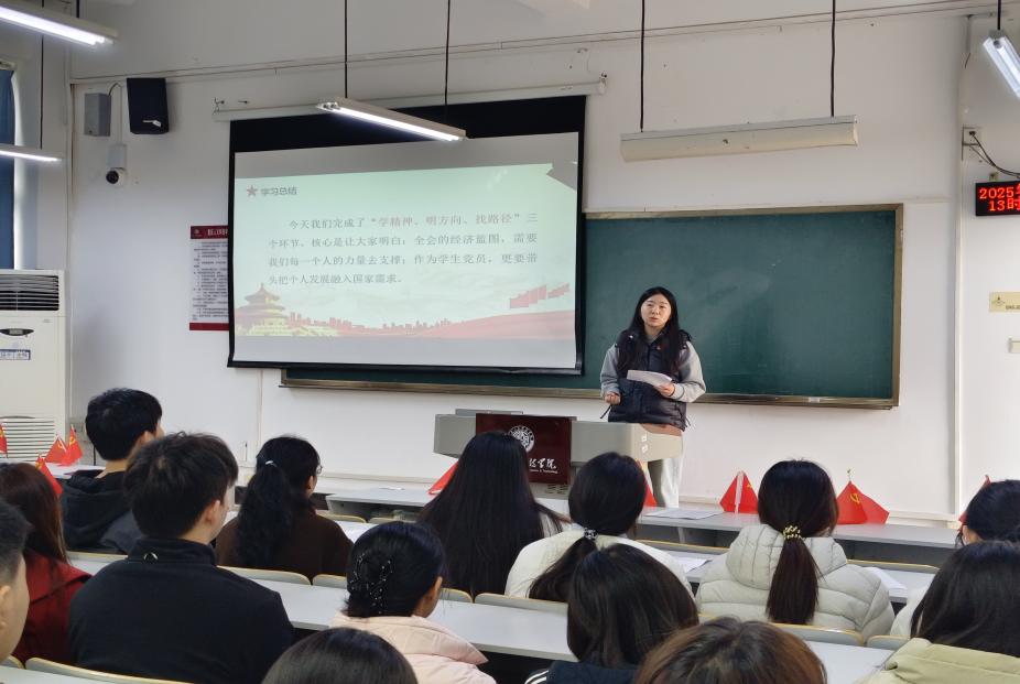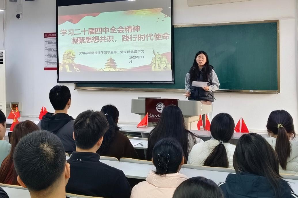 为深入学习贯彻党的二十届四中全会精神,切实把支部党员的思想和行动统一到党中央决策部署上来,将全会精神转化为履职尽责、干事创业的强大动力,2025年11月19日,文新学院学生第三党支部在文渊楼9606开展以“凝聚思想共识,践行时代使命”为主题的专题党课学习活动。本次党课由支部书记刘琦同志主持,支部全体师生党员参会。