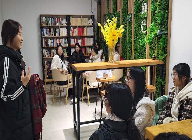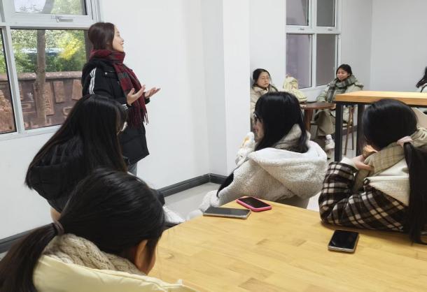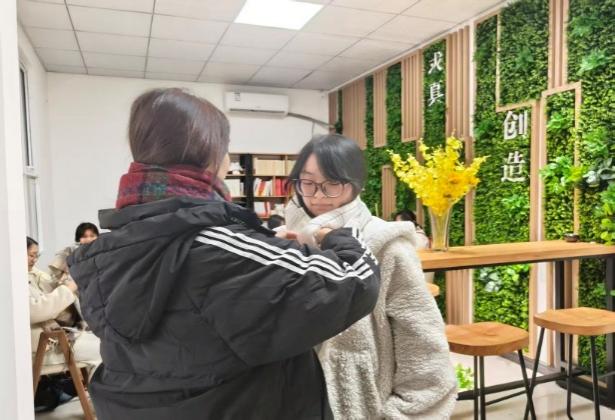 活动分为“教学讲述”“自我练习”“成果展示”三大环节。首先,在“教学讲述”环节中,“小先生”先进行十种围巾系法的现场示范,让学生直观掌握操作技巧。其次进入“自我练习”环节,参与者自由组成多个练习小组,在志愿者“一对一”指导下开展协作练习,通过反复尝试,逐步掌握手法要领。并在互相指导中深化理解,营造出“做中学、学中悟”的浓厚氛围。最后的“成果展示”环节,参与者提交自己系围巾的摄影作品,并分享活动学习心得。在活动过程中不少同学创意十足,将围巾系法与个人穿搭风格巧妙结合,展现出良好的审美素养与实践能力。