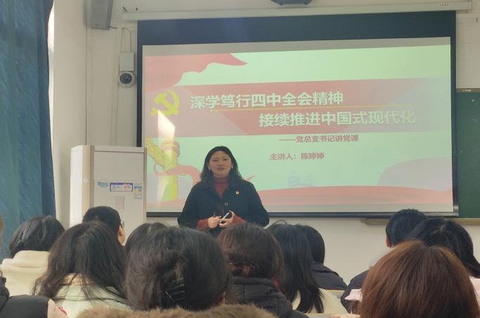 2025年12月11日,文学与新闻传播学院党总支书记陈婷婷在文渊楼9402教室,以“深学笃行四中全会精神 接续推进中国式现代化”为题,为学生党支部全体党员讲授专题党课。